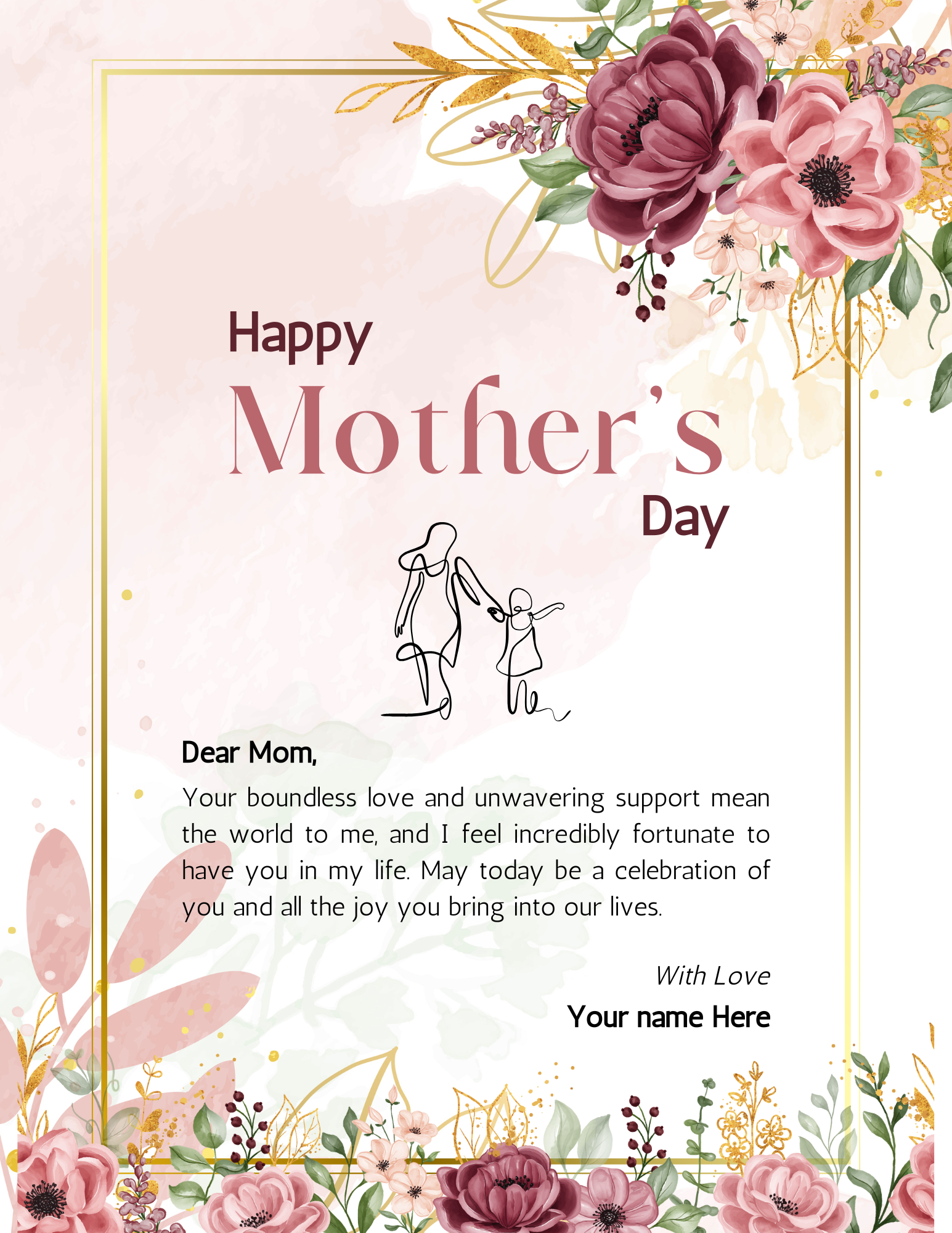 Celebrate the most important woman in your life with our beautifully designed Pink & Beige Floral Mother’s Day Letter. Featuring an elegant floral border, heartfelt message, and customizable signature, this letter is the perfect keepsake to show your mom just how much she means to you. Printed on premium cardstock for a luxurious finish, it blends modern design with timeless sentiment.