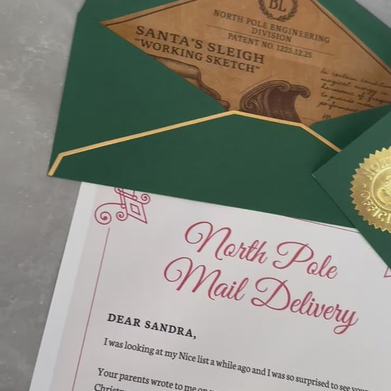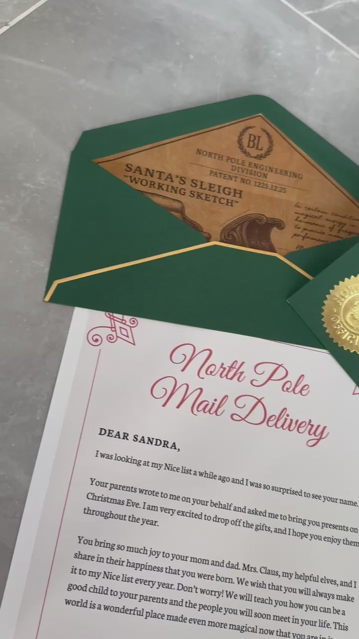 Make Christmas unforgettable with the Green Tier. Your personalized North Pole Letter is printed on premium white cardstock, wrapped with hand-tied natural rope, finished with a metallic red wax seal, and placed inside a dark green envelope with gold trim and authentic North Pole seal. A keepsake your child will treasure for years.