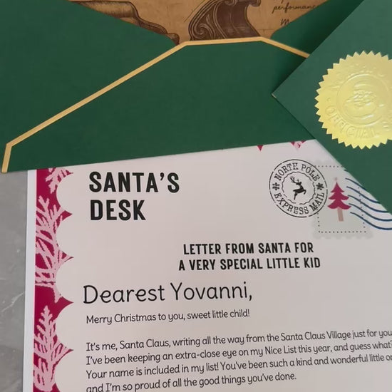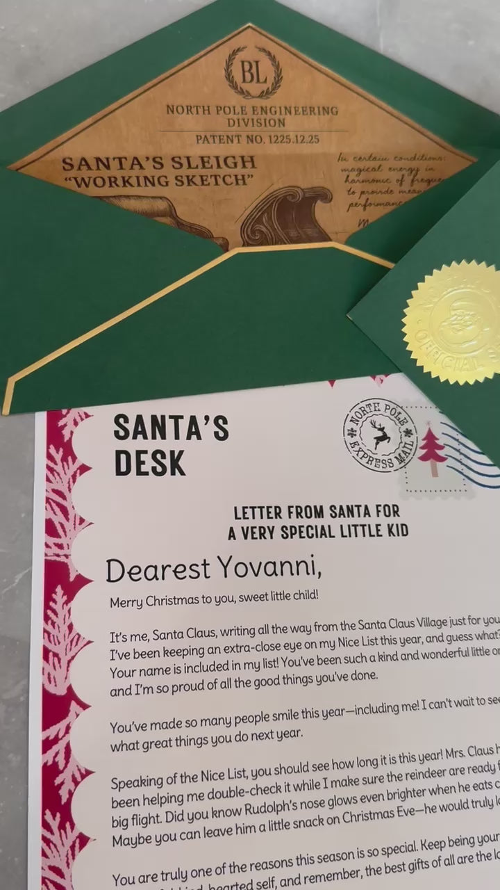 Make Christmas unforgettable with the Green Tier. Your personalized Letter from Santa’s Desk is printed on premium festive cardstock, wrapped with hand-tied natural rope, finished with a wax seal, and placed inside a green decorative envelope with gold trim. A keepsake your child will proudly treasure for years.